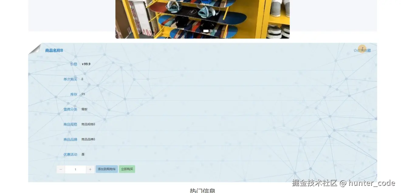 雪具商品:在雪具商品页面的输入栏中输入商品名称、商品品牌、价格和选择优惠活动进行查询,可以查看到雪具商品详细信息,并根据需要进行添加到购物车、立即购买操作;雪具商品页面如图5-3所示: