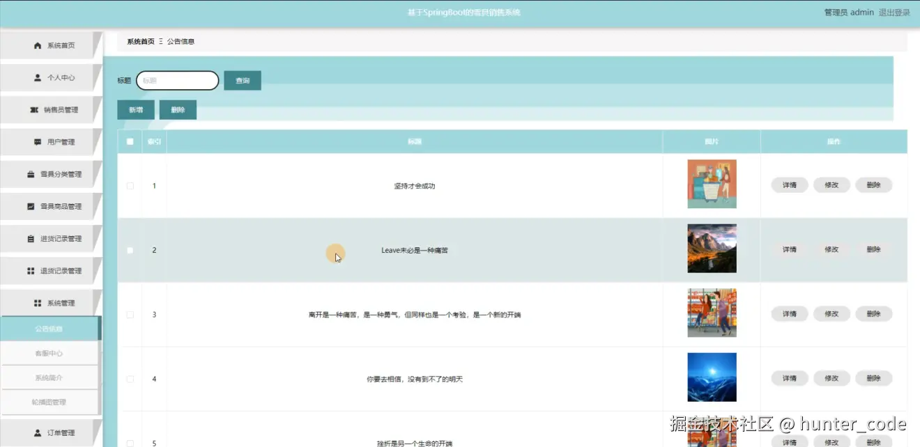 管理员点击系统管理。在公告信息页面输入标题进行查询、新增或删除公告信息列表,并根据需要对公告详情信息进行详情、修改或删除操作,还可对客服中心、系统简介、轮播图管理进行相应操作;如图5-13所示: