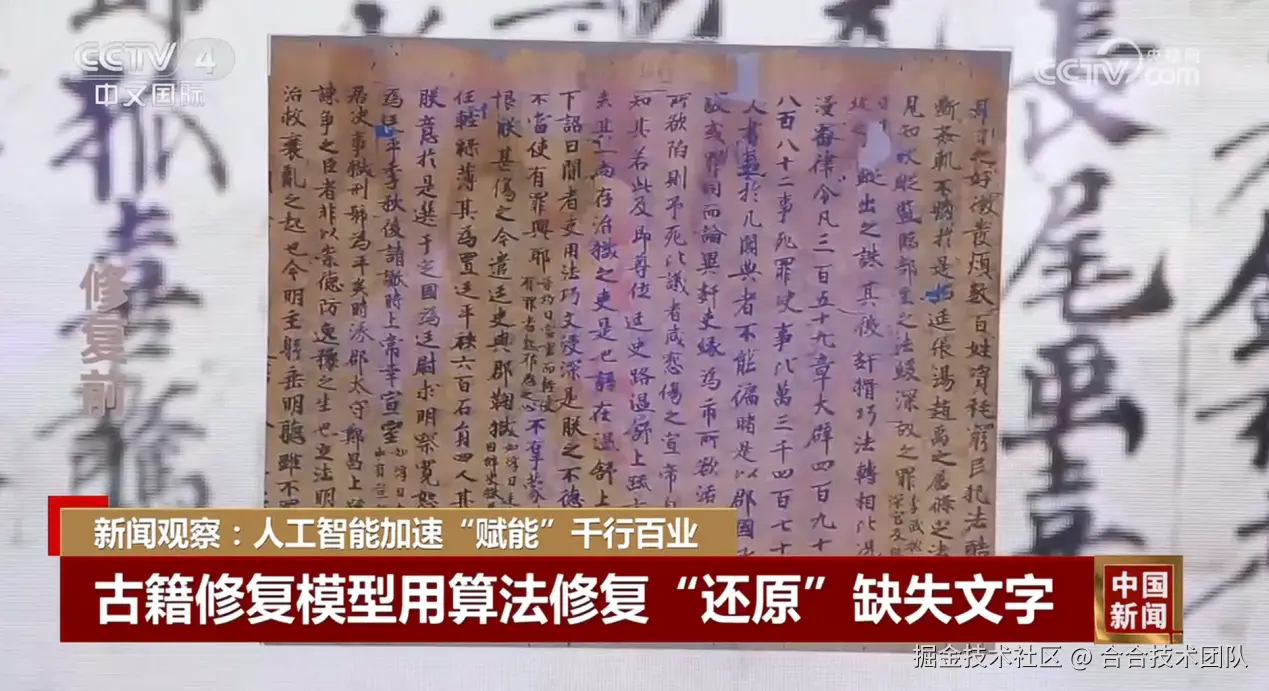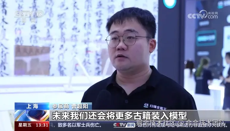 CCTV-13就文化保护如何与科技融合的话题,对扫描全能王事业部负责人曹超阳进行了采访。曹超阳提到,模型能够智能学习不同古籍的页面特点,尽可能对缺损区域的文字风格和背景进行1:1还原,做到“修旧如旧”。