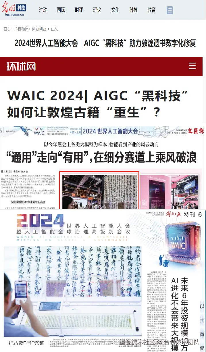 扫描全能王用生成式人工智能技术修复《敦煌遗书》页面和文字,赋能传统文化保护的工作,收获了大量媒体的肯定,登上了《人民日报》2024年7月2日的版面报道;Shanghai Daily 评价该项工作为‘AI breathes new life into ancient treasures’(AI为古老的宝藏注入新的生命)。