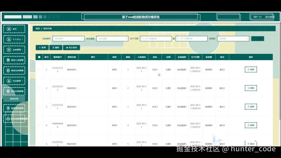 物资详情管理,在物资详情管理页面可以对索引,物资编号,物资名称,图片,体积,数量,入库时间,状态,位置,存放温度,生产日期,保质期,备注等内容进行删除操作,如图5-7所示。