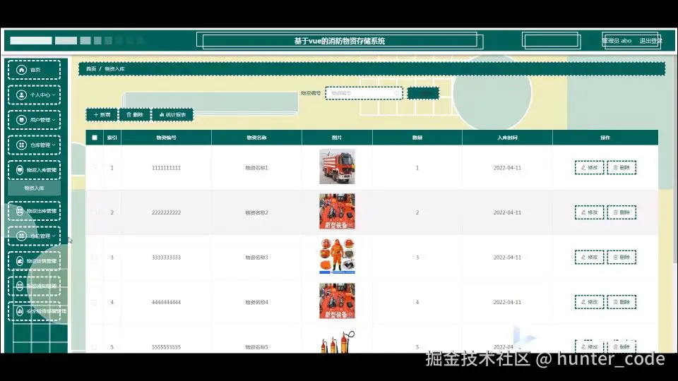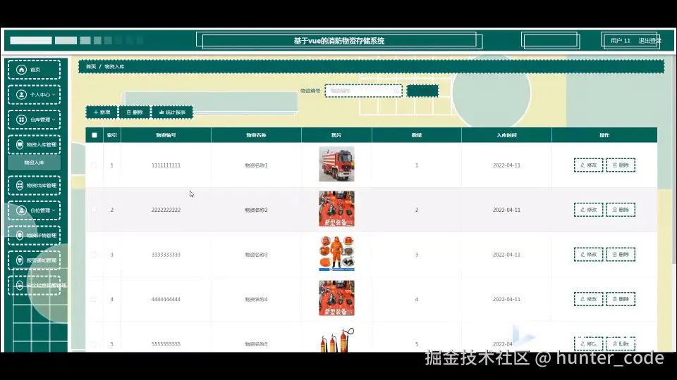 物资入库管理,在物资入库管理页面可以对索引,物资编号,物资名称,图片,数量,入库时间等内容进行修改和删除操作,如图5-12所示。