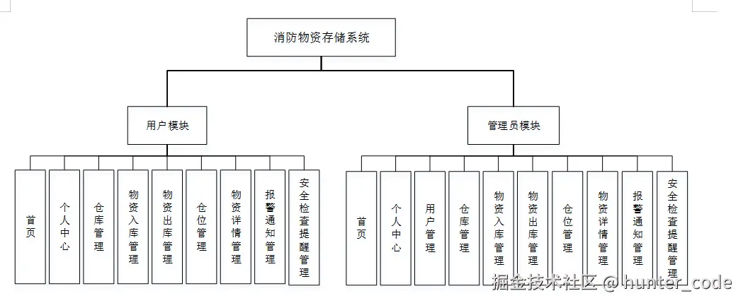 为了更好的去理清本系统整体思路,对该系统以结构图的形式表达出来,设计实现该消防物资存储系统的功能结构图如下所示: