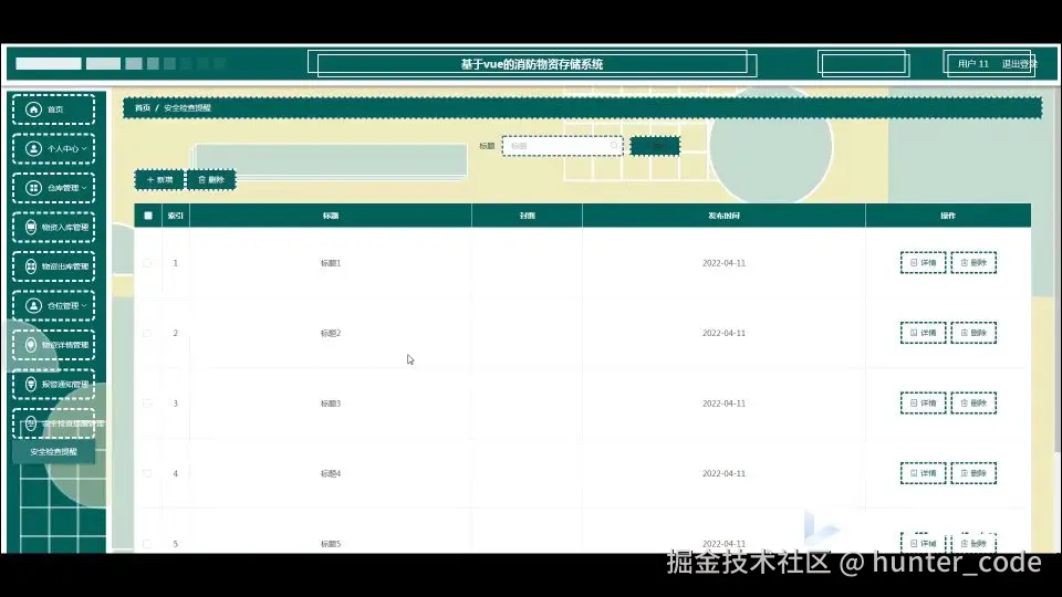 安全检查提醒管理,在安全检查提醒管理页面可以对索引,标题,封面,发布时间等内容进行详情和删除操作,如图5-9所示。