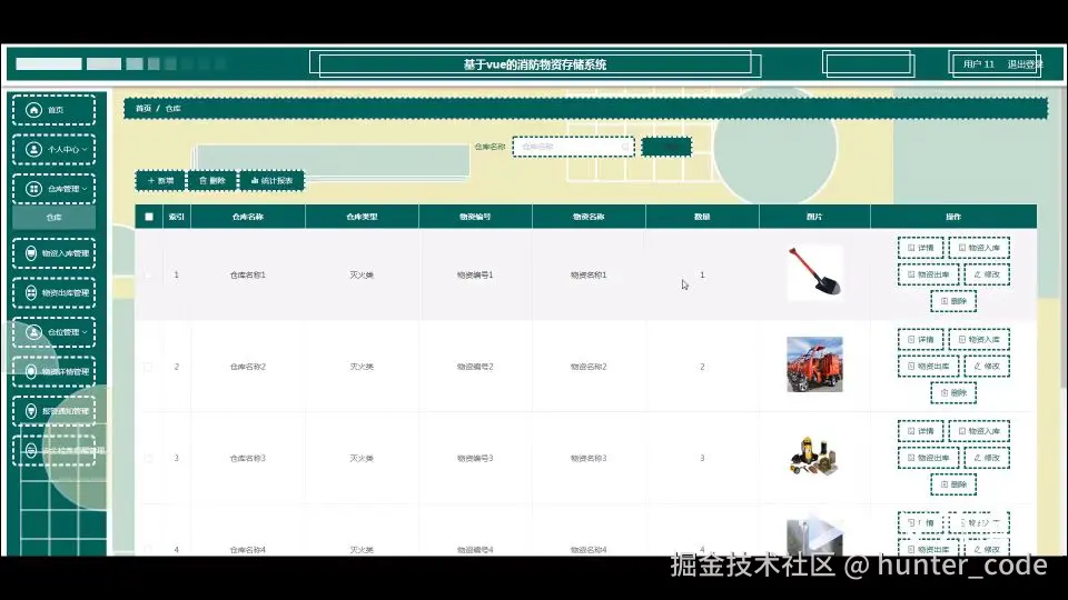 仓库管理,在仓库管理页面可以对索引,仓库名称,仓库类型,物资编号,物资名称,数量,图片等内容进行详情,物资入库,物资出库,修改和删除等操作,如图5-11所示。