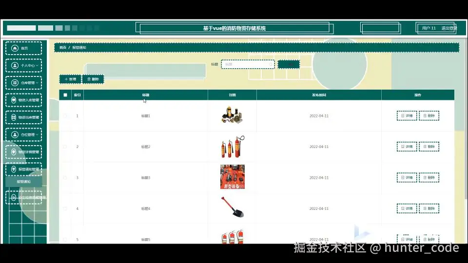 报警通知管理,在报警通知管理页面可以对索引,标题,封面,发布时间等内容进行详情和删除操作,如图5-8所示。