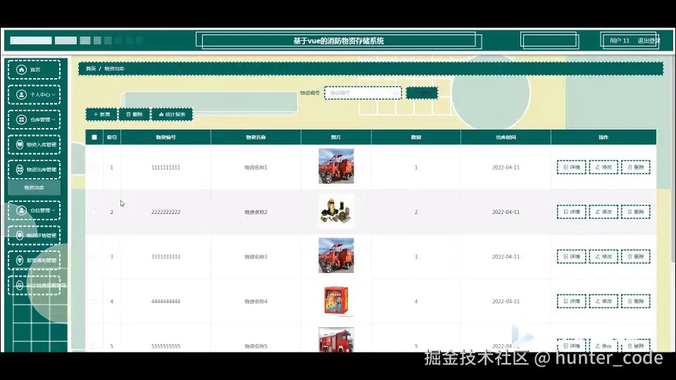 物资出库管理,在物资出库管理页面可以对索引,物资编号,物资名称,图片,数量,出库时间等内容进行详情,修改和删除等操作,如图5-5所示。