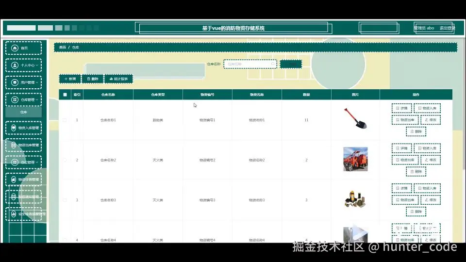 仓库管理,在仓库管理页面可以对索引,仓库名称,仓库类型,物资编号,物资名称,数量,图片等内容进行详情,物资出库,物资入库,修改和删除操作,如图5-3所示。