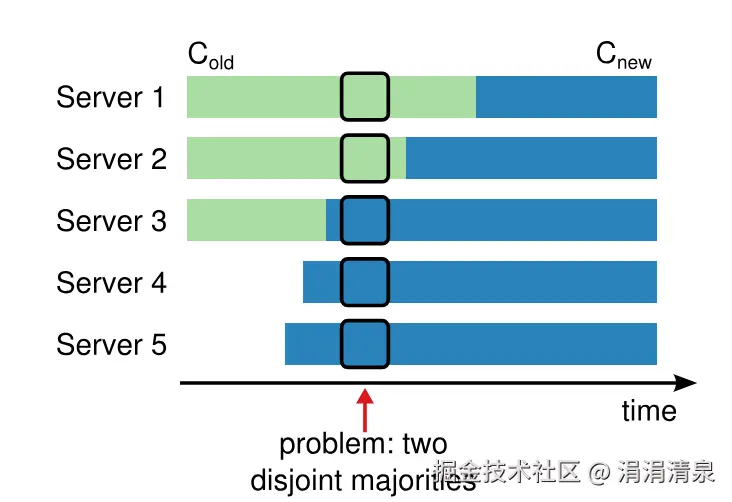 那么这里会涉及到一个过渡态的问题,集群在配置迁移过程中,依然需要响应Client的请求,那么当部分机器迁移到新配置,部分还在旧配置,那么此时就有两个集群的存在,然后就会有可能出现两个Leader,脑裂。