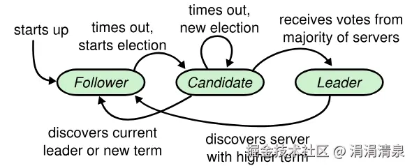 Raft中服务器状态仅有三种,Follower、Candidate、Leader。