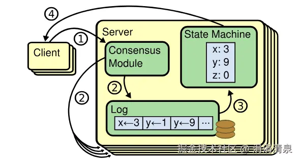 复制状态机,是一致性算法的基础。基本上一致性算法的实现都是通过以下方式实现。
