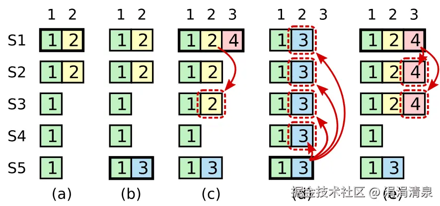 (a) S1 是Leader,S2 这个跟随者复制了索引位置 2 的日志条目,S3、S4、S5只复制了索引位置 1 的日志条目。