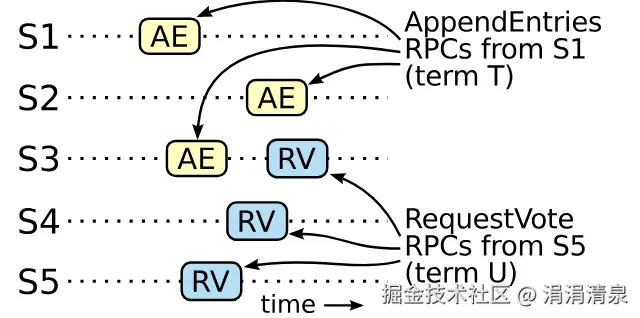 同样,别的Candidate赢得选举变成Leader后也会发起心跳RPC,其他Candidate在等待选票的同时也会有可能收到“新”Leader的心跳RPC,收到心跳RPC之后,参选的Candidate会对比心跳RPC的任期与自身的任期,如果比自身要高就退化成了Follower,比自身低则不“承认”这个leader继续等待选票结果。