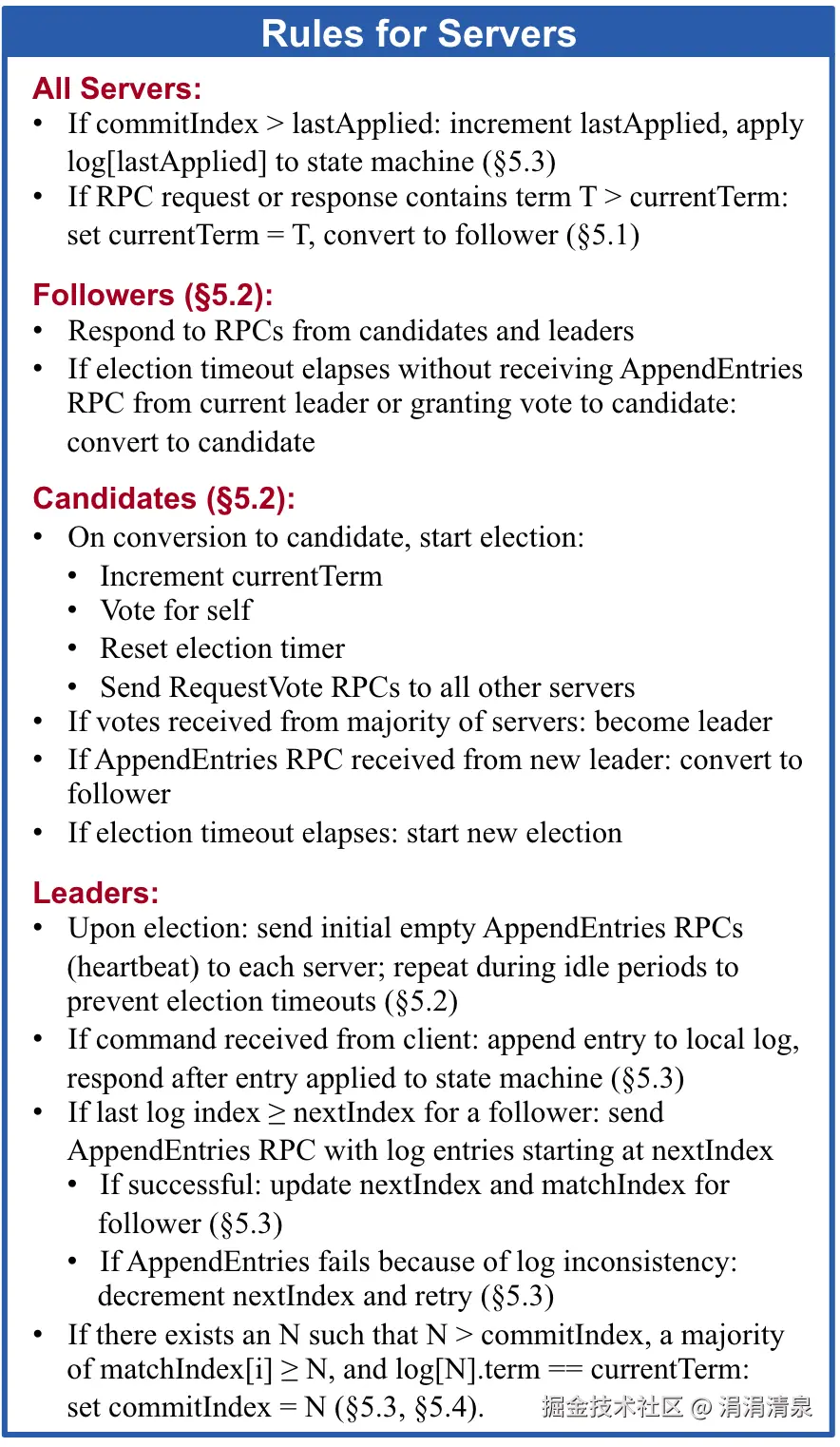 还有一些针对所有服务器的规则,即服务器的一些状态变化所遵循的规则,如Follower转向Candidate后需要将自身currentItem自增1等等,在后续都会介绍。