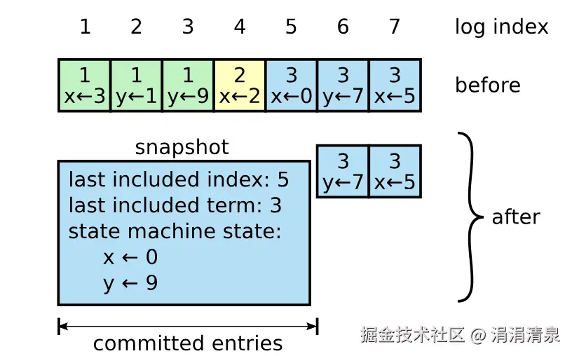 下面就是Raft快照方式,将已提交的日志对应状态机内容、所“照下来”的最后一个日志条目的索引与任期快照下来。