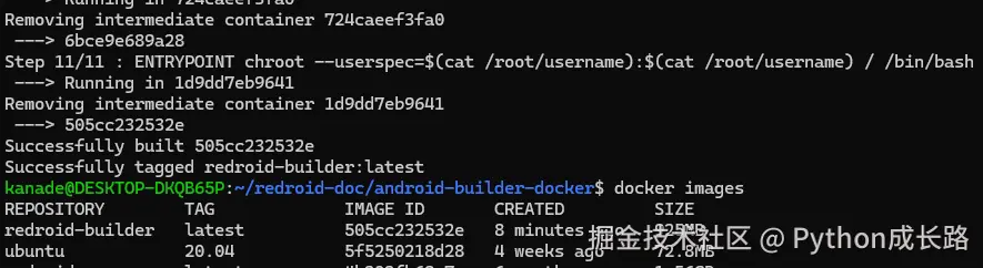 然后开始构建docker镜像: docker build --build-arg userid=$(id -u) --build-arg groupid=$(id -g) --build-arg username=$(id -un) -t redroid-builder .