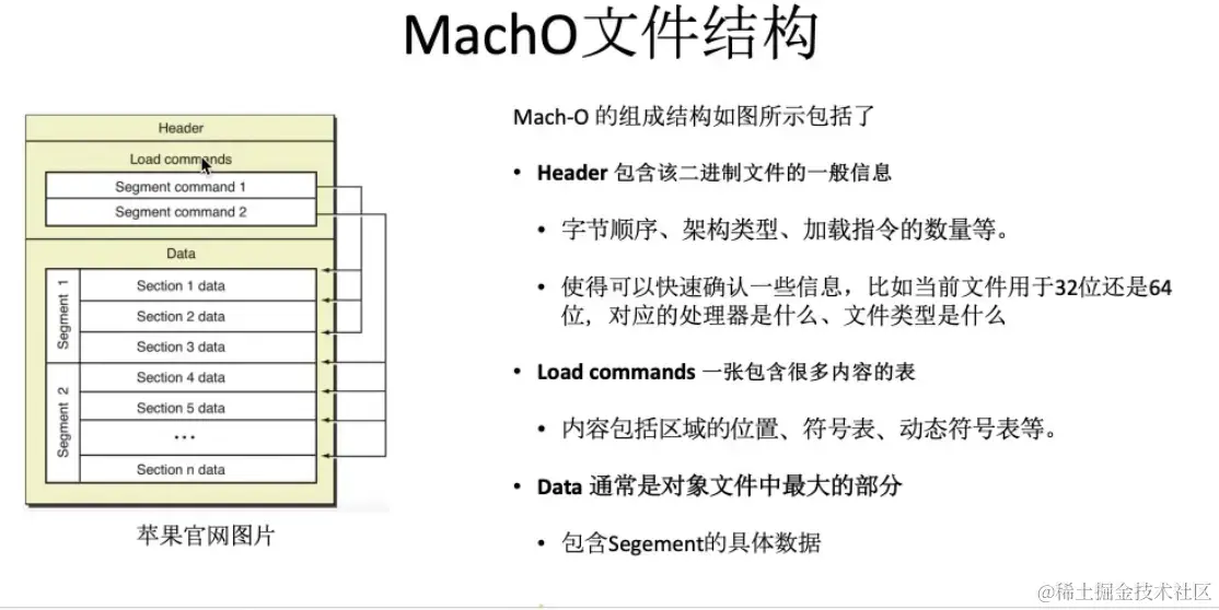 在iOS中,最终生成的可执行文件是Mach-O文件格式(Mach Object)。Mach-O文件包含以下部分: