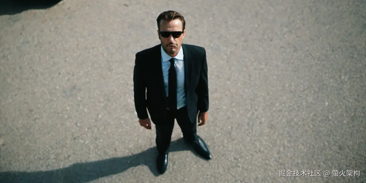 a agent, looks ahead in confusion, (bird's eye view)