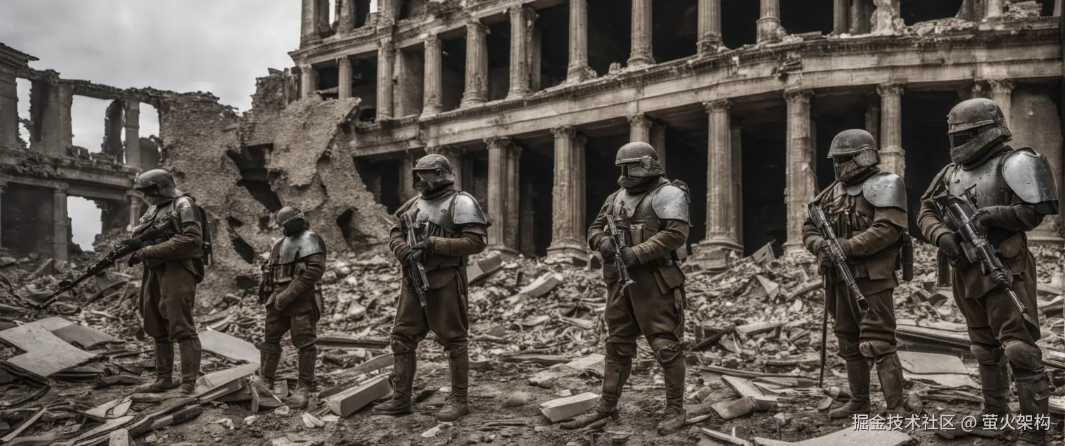 A band of imperial soldiers, clad in their heavy armor, stand solemnly amidst the rubble and remnants of what was once a grand structure, (((knee level shot))), photo,