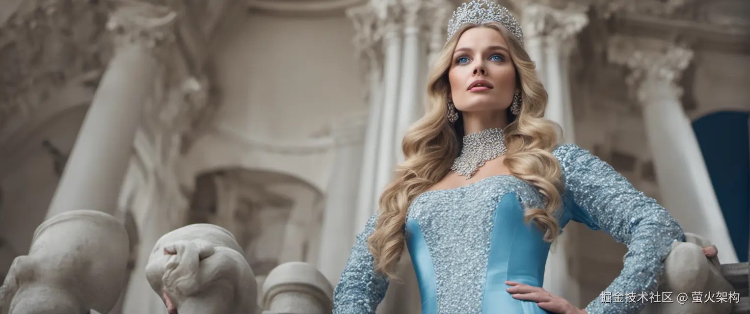 the haughty princess, gazes straight ahead, blue eyes, front of house, low angle shot, from below, photo,
