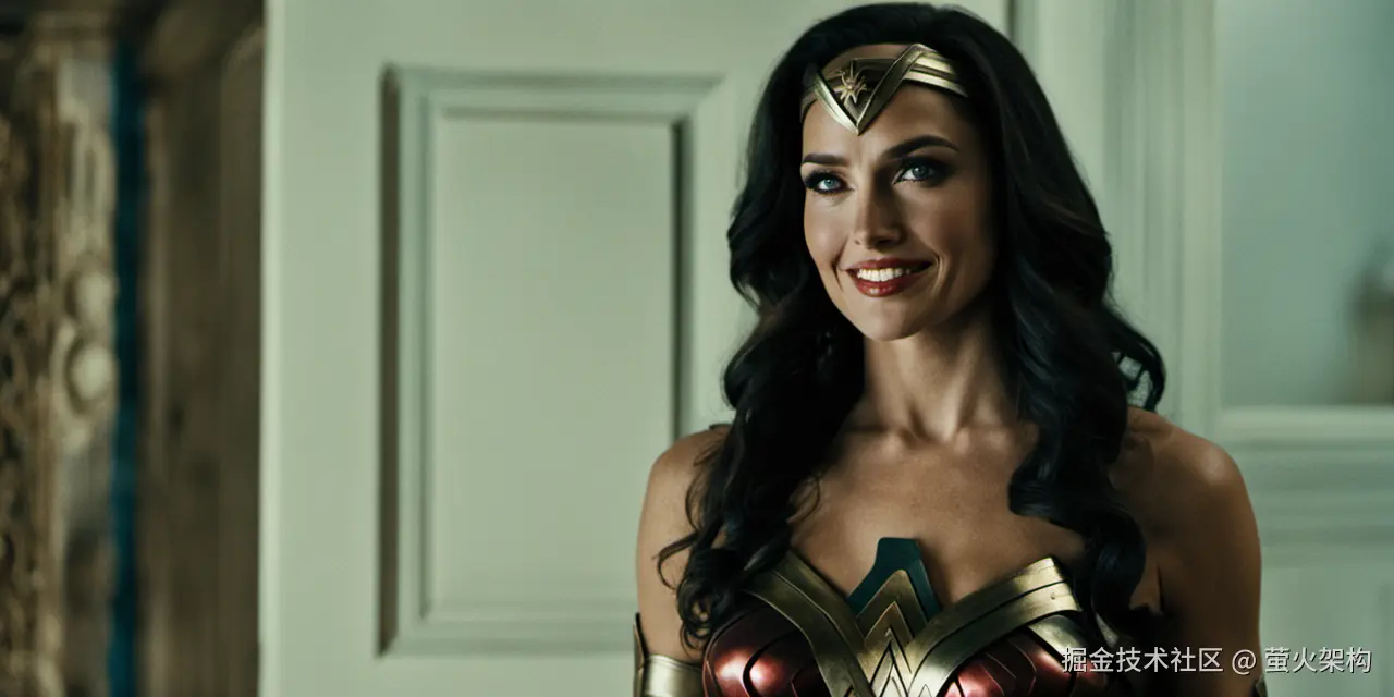 the wonder woman, looking at viewer, smile, standing, front of house, medium shot, photo,