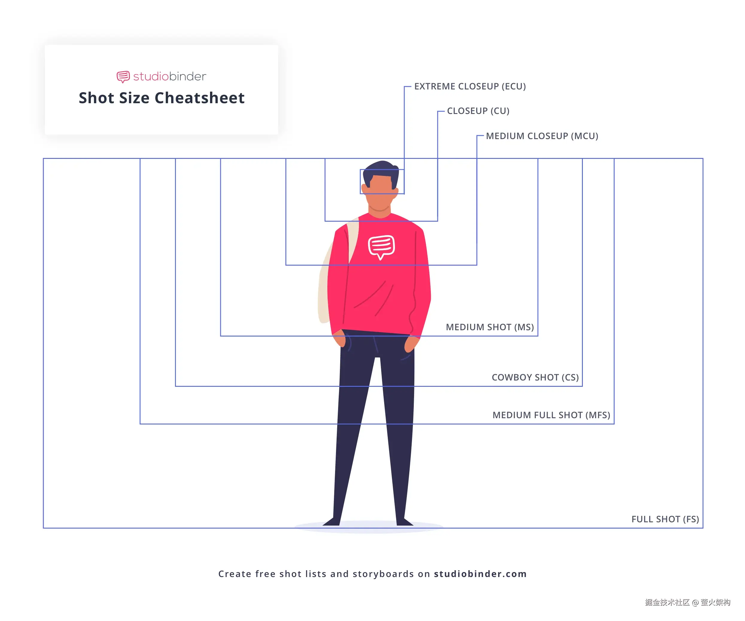在长镜头(或宽镜头)中,主体看起来最小;在中景镜头中,它们的大小会大一些;在特写镜头中,它们的大小最大。以下是每一种镜头尺寸对于人物主体在画面中展现部分的参照示意图,可以帮助大家清楚地了解不同镜头尺寸的视觉效果,以及如何区分各种镜头尺寸。