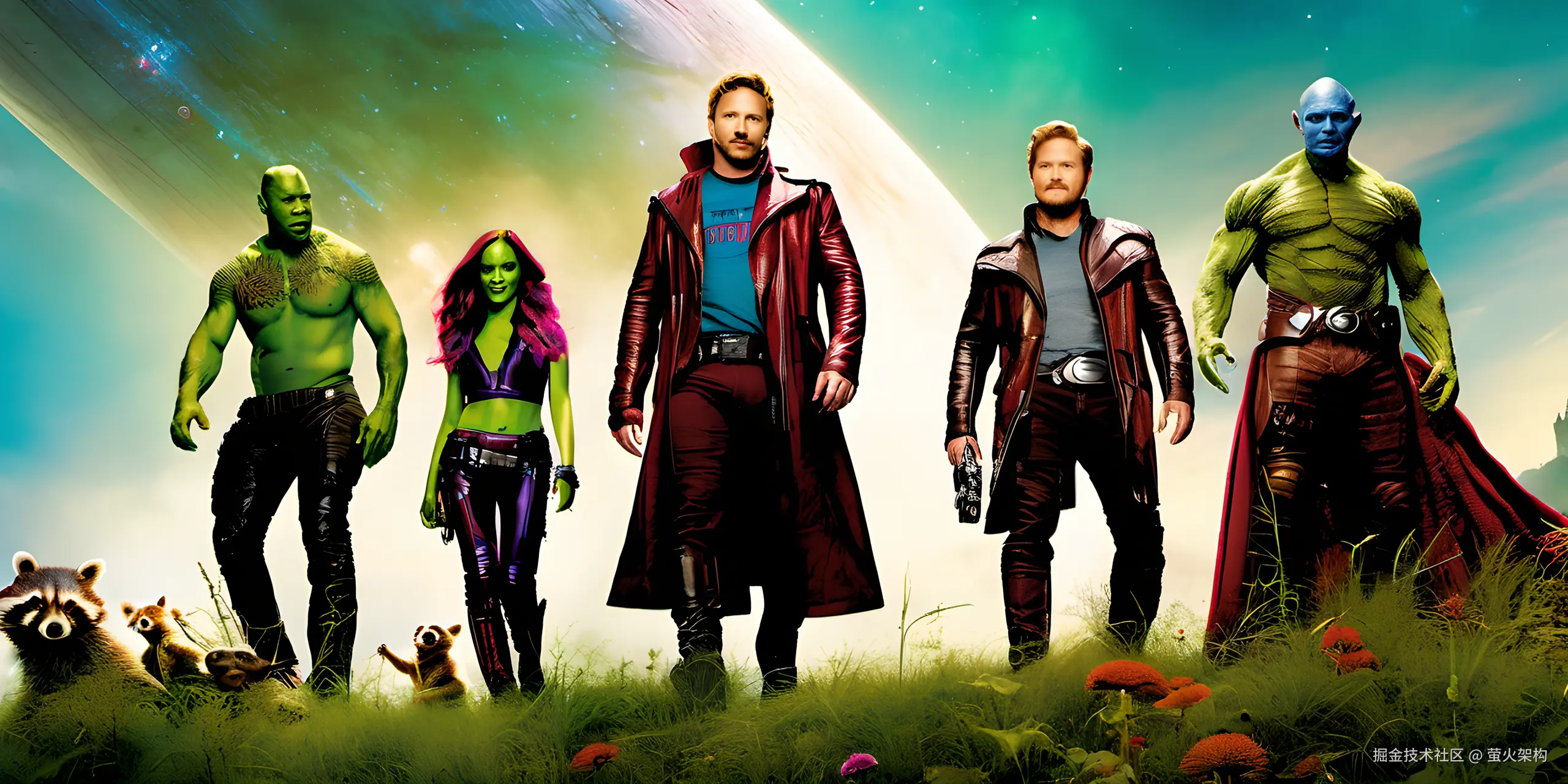 photo, full shot, the Guardians of the Galaxy, five persons, a band of interstellar adventurers, are gathered on a verdant meadow, looking at viewer,