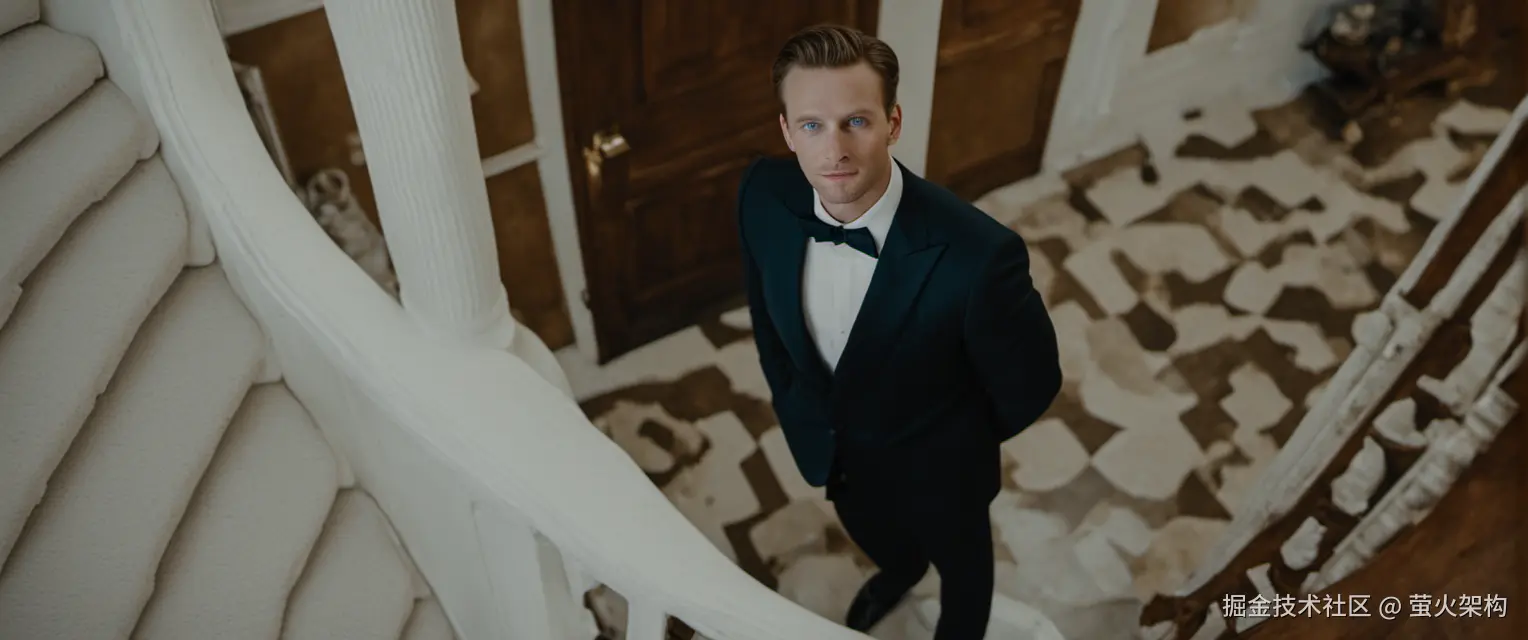 a suitor stands downstairs, looking up, blue eyes, front of house, (((high angle shot, from above, ))), photo,