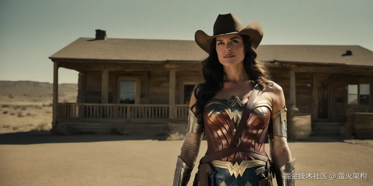 cowboy shot, photo, the wonder woman, looking at viewer, smile, standing, front of house