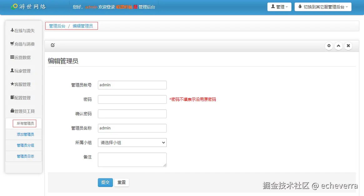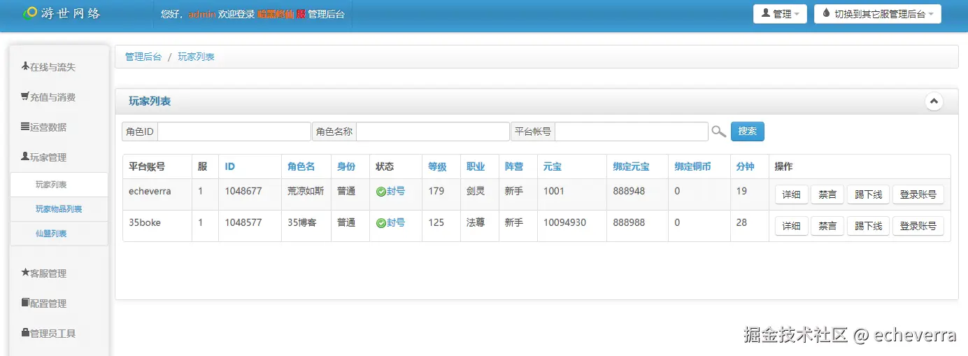 游戏运营后台:http://IP:9981/admin/admintool/,初始账号:admin,密码:123456,功能还是比较多的,可以自行尝试。