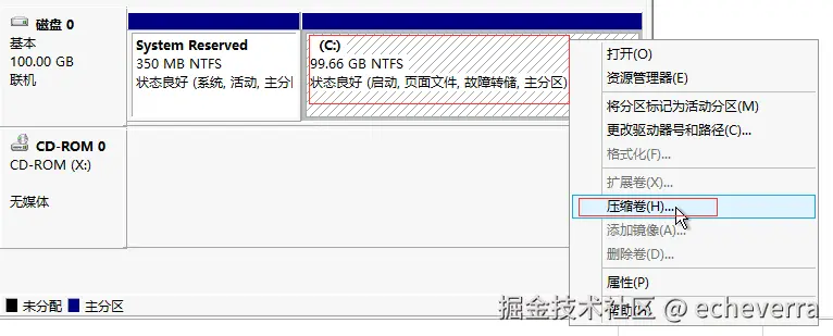 点击 C 盘,鼠标右键,选择压缩卷。