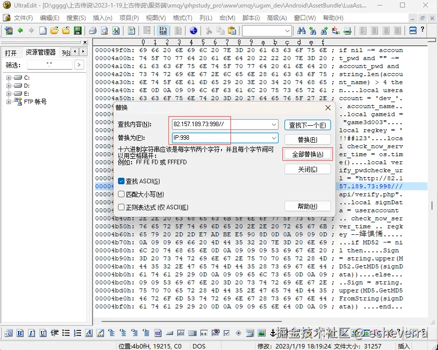 安卓和苹果热更文件修改都需要对位,以安卓第一个文件修改为例。搜索82.157.189.73:998//,一共 19 位,改为你的 IP 后也要保持一共 19 位,如果 IP 位数少最后添加/,比较长就最后删除/。