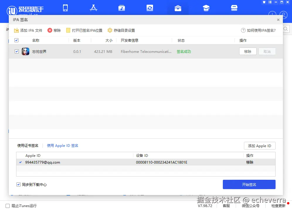修改好后我们需要借助爱思助手签名,签名后就可以成功安装到自己的苹果手机中,需要在手机设置-通用-设备管理中信任该软件才可启动。