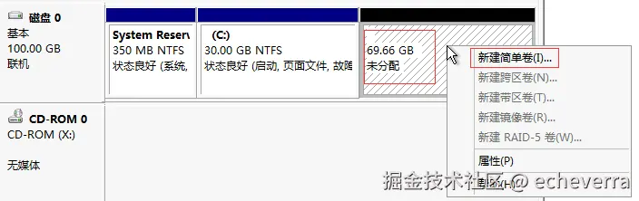 完成后就会显示压缩的磁盘,点击该磁盘,鼠标右键,选择新建简单卷。