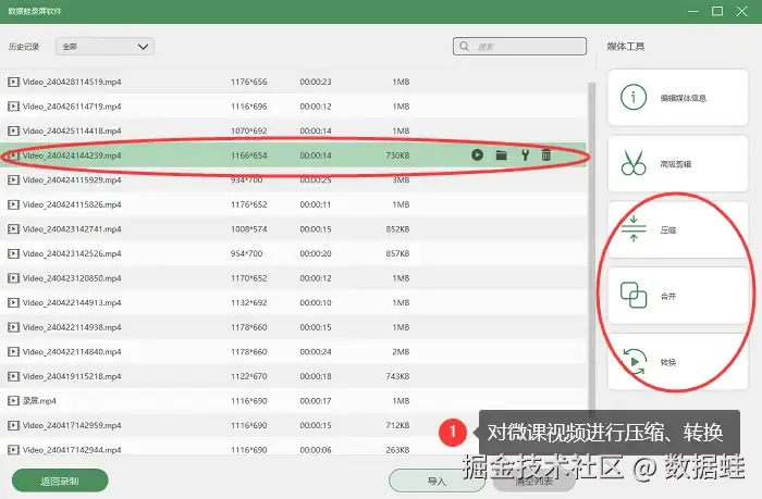 步骤4:在历史记录页面,我们可以对录制的视频进行压缩、转换、合并等。然后点击“导出”按钮将视频导出到本地。