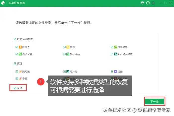 步骤2:互连成功后,我们需要选择数据类型,可以直接全选,或根据需要选择部分。然后就可以开始扫描啦!