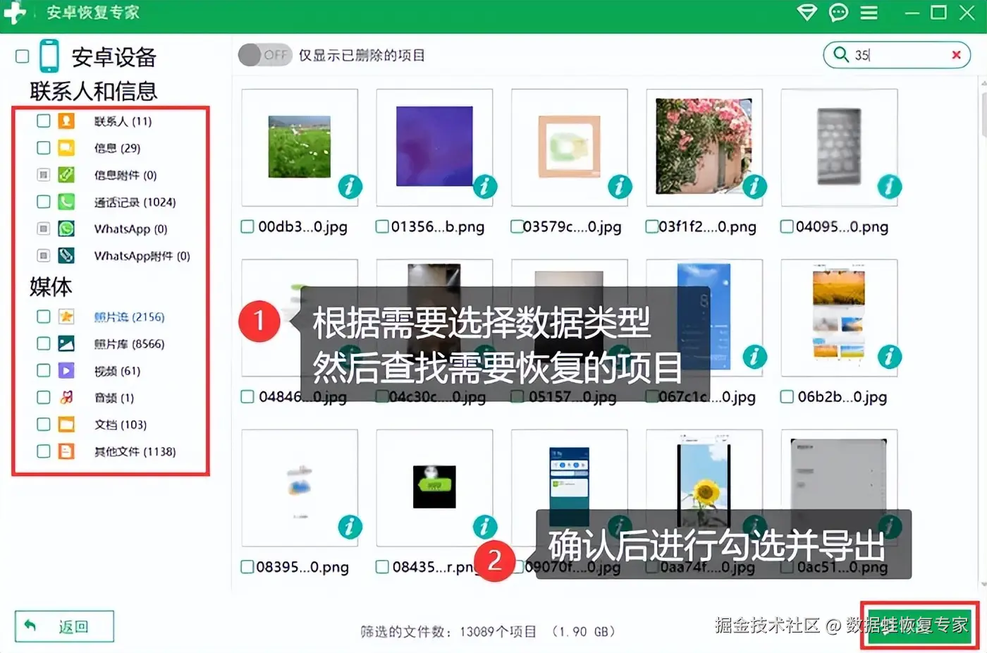 步骤3:以手机照片为例,我们需要查看哪一张照片是需要恢复的,确认后勾选它,然后继续查找下一张。当你寻找完毕,就可以点击右下角的 【导出】 按钮,将它们保存到电脑上啦!