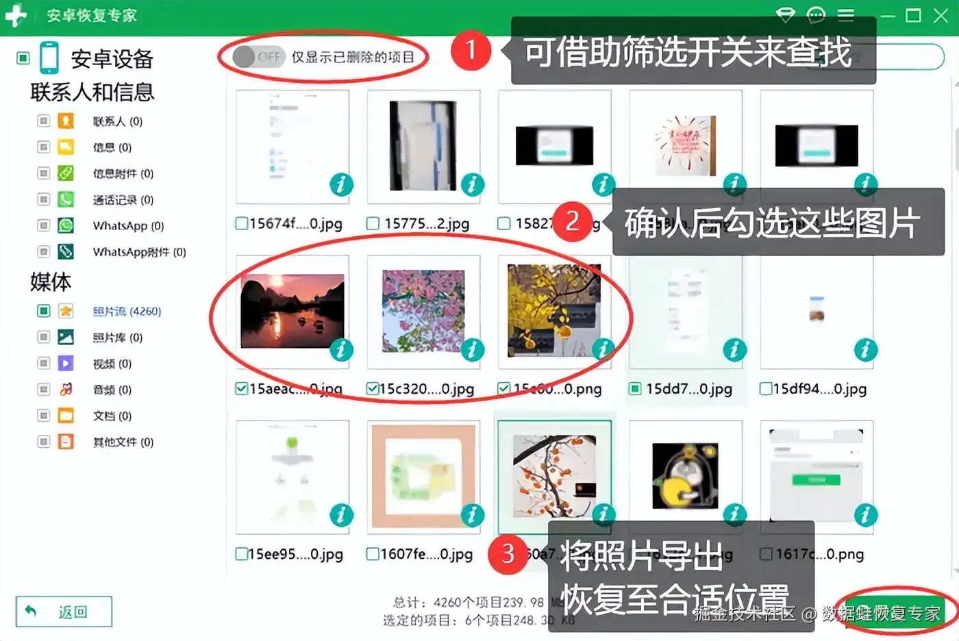 如果你没有开启云备份功能,或者你的云盘存储空间不足,那么你可以尝试使用专业的数据恢复软件来恢复你的照片。这种方法的优点是恢复效果好,可以恢复大部分丢失的照片。小编要强力推荐【数 据 蛙 安卓恢复专家】,它采用先进的扫描和恢复技术,能够深入手机存储设备,最大限度帮助用户恢复数据。除了照片之外,它还支持恢复视频、音频、通讯录等手机数据,操作步骤清晰易懂。