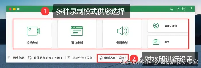 步骤2:进入软件的首页,您可以看到多种录制模式供您选择,同时可以对录制水印进行调整,可以设置特有的水印也可以进行无水印录制。小编在此选择 【视频录制】 为您演示操作步骤。