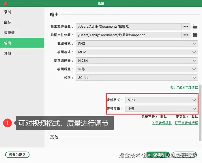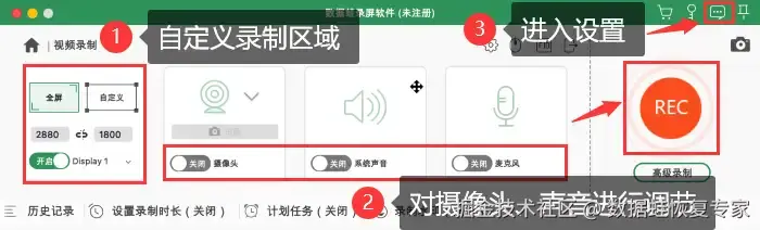 步骤3:在 【视频录制】 界面中,首先可以自定义好录制的区域。Mac怎么录屏带声音?这时需要您对系统声音、麦克风进行打开操作,这样录制出的视频就会带有声音。如果您对视频的输出有更多的需求,可以通过点击右上角三个点的标志进入 【设置】 ,在输出设置中对视频格式、质量等进行调整。设置完毕后就可以点击 【REC】 进行录制了。