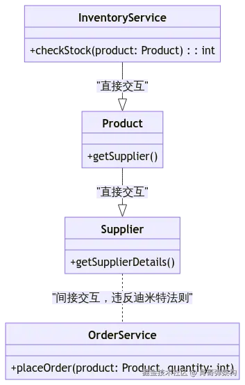 product.getSupplier().notifyStockLevel(); // 间接交互