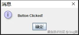 这段代码为按钮添加了一个ActionListener。当按钮被点击时,会触发actionPerformed方法。在这个方法内部,使用JOptionPane.showMessageDialog弹出一个包含消息"Button Clicked!"的对话框。