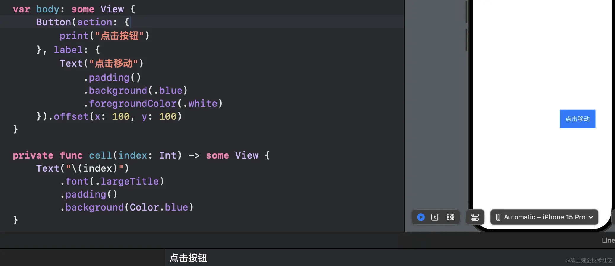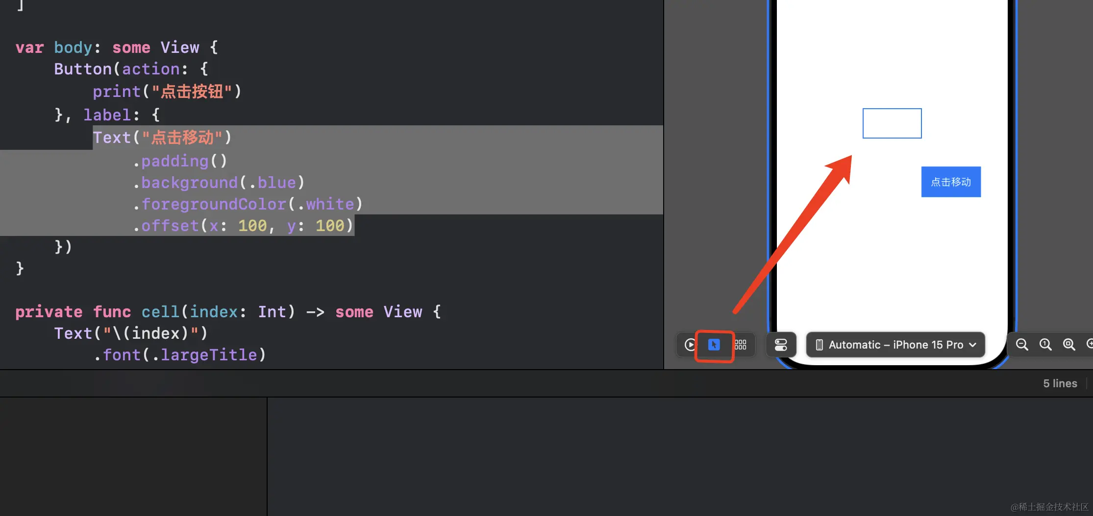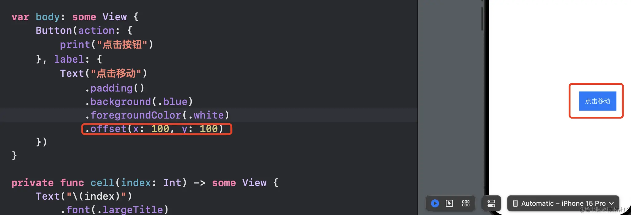 swiftui中使用.offset时候注意事项,为什么按钮点击没反应 1024小神 2024-07-12 179 阅读1分钟 当你在一个按钮的子视图上使用.offset(x: 100, y: 100)的时候,有没有当你点击这个按钮的时候,没有任何效果?不会出发按钮的点击行为? 这是因为你在按钮的子视图上使用.offset(x: 100, y: 100)的时候,其实偏移的只是子视图的内容,但是按钮的位置还是在原地的: 切换到选中模式就可以看出来,按钮的位置还是在原来的白色位置,你点击这个白色位置,就会触发按钮的action行为 所以如果你想让内容和按钮一起偏移,就需要在Button上使用偏移:这样点击就有效果了
