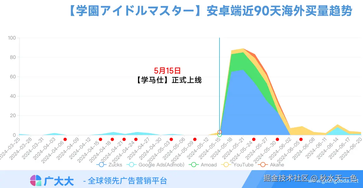 先从最基础的投放买量来看,根据广大大抓取数据显示,学园偶像大师从2024年3月7日开始买量投放,双端累计投放素材去重数量不足1000条,下图可以看出学园偶像大师没有在预约转化上费太多力气。