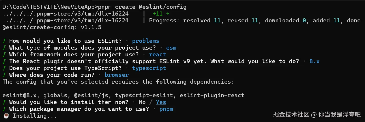 输入下面的命令,进行 Eslint 初始化,然后按下图进行配置选择
