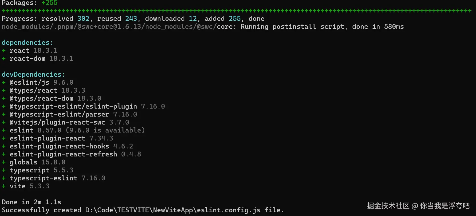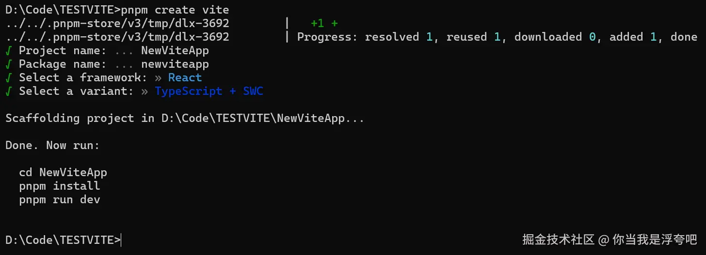 如下所示,进入你想创建项目的文件夹,运行 pnpm create vite, 会提示让你输入项目名,然后选择 React,然后选择 TS + SWC 即可,