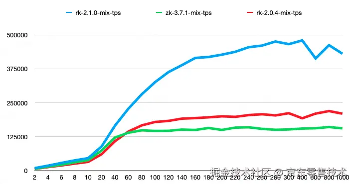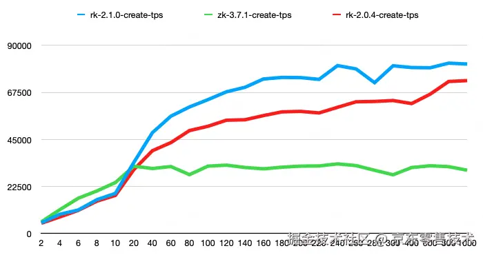 在性能测试中,我们使用了raftkeeper-bench工具,测试环境为三个节点组成的集群,每个节点配置为16核CPU、32GB内存和100GB存储空间。测试对象包括RaftKeeper v2.1.0、RaftKeeper v2.0.4和ZooKeeper 3.7.1,均采用默认配置。