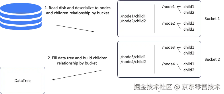 由于第二步是单线程执行,可以改成并行的方式,并行化改造的基础是DataTree是一个二层HashMap结构,改造后每个线程负责固定的bucket,这样避免了并发问题。具体流程为首先从磁盘读取数据并按照bucket的粒度存储节点和父子关系,然后填充DataTree并构建父子关系。