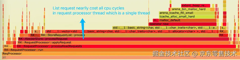 依然是同一个RaftKeeper集群,通过火焰图发现,List请求处理几乎消耗了request-processor线程所有的CPU时间片。在RaftKeeper的执行链路中request-processor负责处理用户的请求,它是一个单线程,所以比较容易成为瓶颈点。