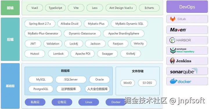 JNPF低代码建立在开放标准和全源码交付基础上。核心技术采用 Spring Boot、Spring Cloud Alibaba,Mybatis Plus、RocketMQ、MinIO 等主要框架和中间件,采用Nacos注册和配置中心,集成流量卫兵Sentinel,前端基于Vue3框架定制开发,帮助企业更快、更高效地进行微服务开发,相较于业界使用广泛的开源版本平台,提供更强大的功能和更全面的服务支持。平台即可私有化部署,也支持K8S部署。